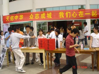 在四川汶川的灾情受到社会各界广泛关注的同时,我校团委、学生会、红十字会、爱心社和各级团学组织积极行动,向全校师生发出“震灾无情,人间有情”的倡议并在学校饮食服务中心门口进行了募捐,“天佑中华,众志成城,我们心在一起”表达了皖医学子向灾区人民爱心和祝福。