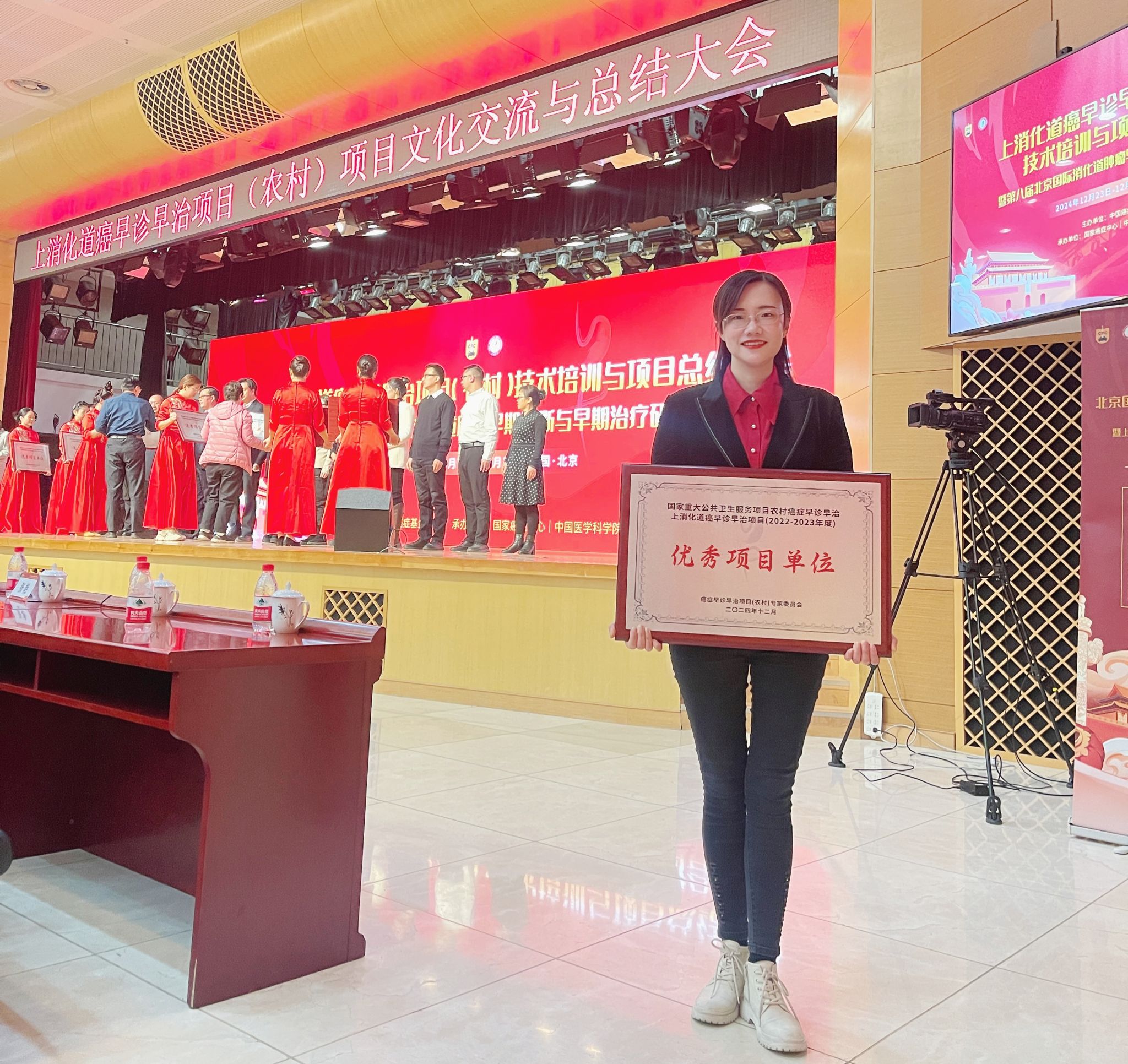 近日,由中国癌症基金会主办,国家癌症中心、中国医学科学院肿瘤医院承办的上消化道癌早诊早治项目(农村)技术培训与项目总结大会暨第八届北京国际消化道肿瘤早期诊断与早期治疗研讨会在北京召开。会上,我校第一附属医院获评国家重大公共卫生服务项目农村癌症早诊早治上消化道癌早诊早治项目(2022—2023年度)“优秀项目单位”,消化内科张妍获评“先进工作者”。