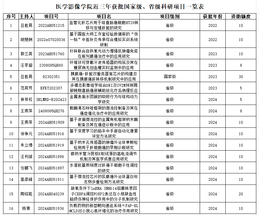 学科建设水平稳步进阶。医学影像学院学科建设成果丰硕,近五年成功获批1个省级临床重点专科和1个校级超声医学研究所,拥有省学术与技术带头人1人、省高校“十五”优秀人才计划中青年学科带头人培养对象1人、省卫生系统首批跨世纪学术及技术带头人培养对象1人、校级学术与技术带头人后备人选1人。学院紧密围绕国家战略需求和地方经济社会发展目标,成功获批安徽省微流控技术与先进材料工程研究中心,近三年获批省级以上科研项目16项,发表一类论文80余篇,其中中科院一区论文近10篇,申请或授权国家发明专利20余项,在学校首次科研考核中“优秀”等次。