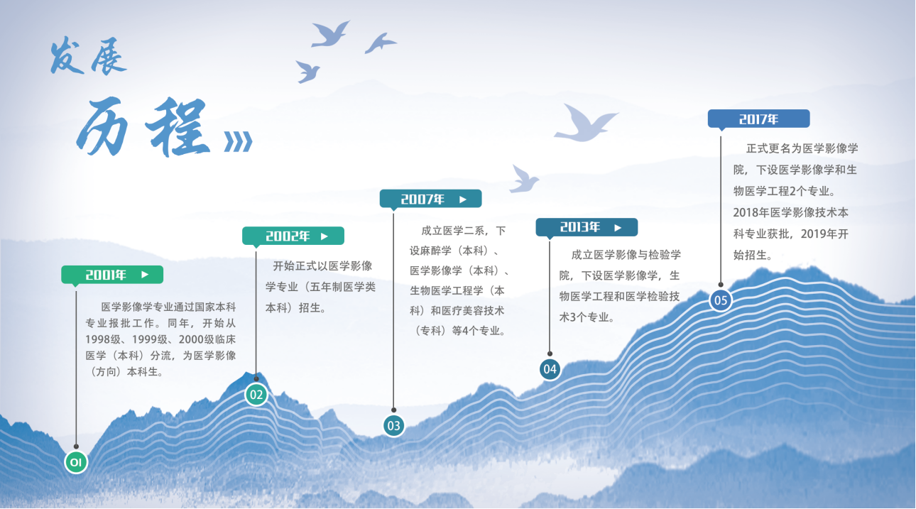 学校2001年获批设立医学影像学专业,2013年成立医学影像与检验学院,2017年正式成立医学影像学院。现有医学影像学、生物医学工程、医学影像技术3个本科专业,是以医学本科教育为主体、工学和理学并举的学院。学院现有校本部教职工50人,其中专任教师33人、辅导员7人,设有党支部7个、教研室8个、实验实训中心1个、省级工程研究中心1个,有在校学生1560人。