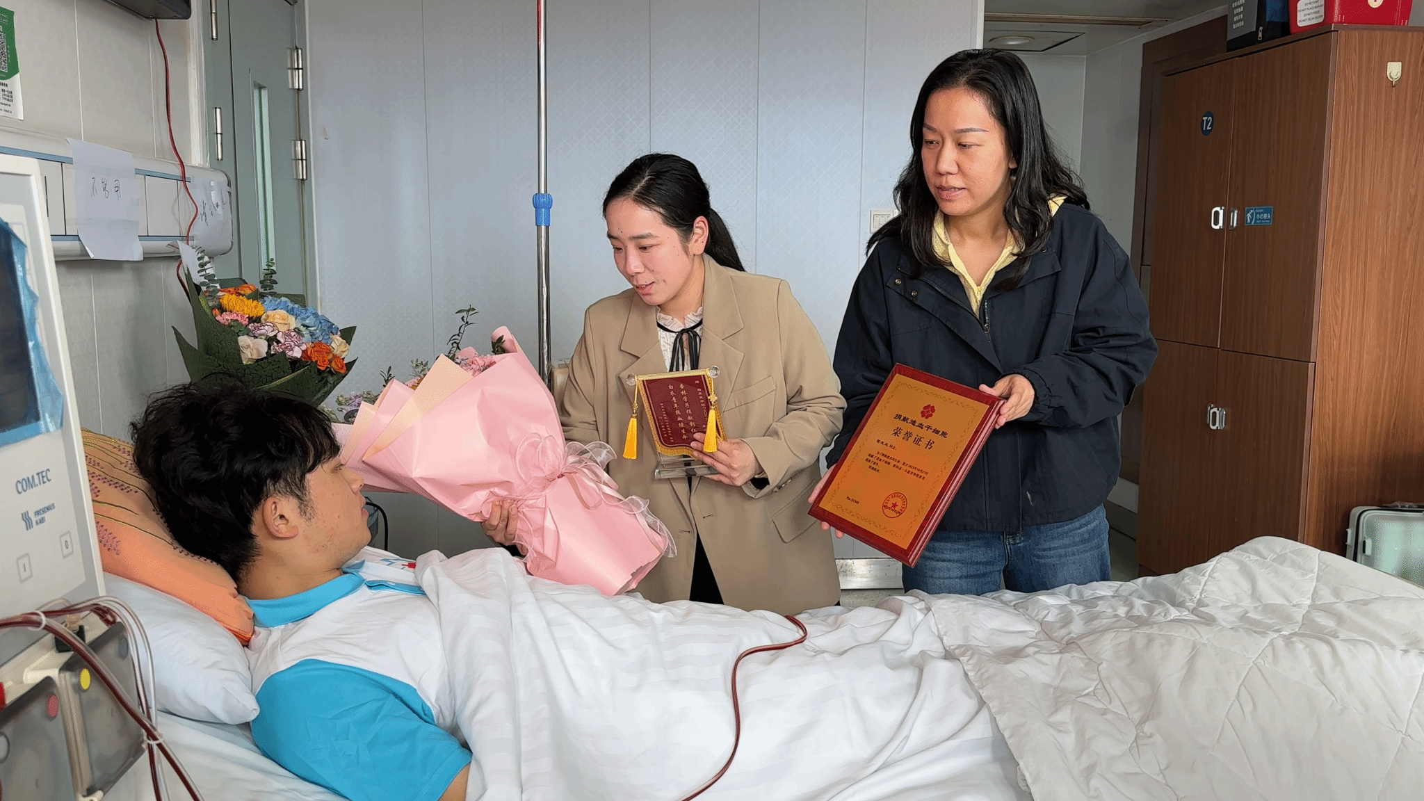 10月27日上午8时,造血干细胞采集正式开始。校党委常委、副院长韩永升率学生处、临床医学院师生代表,与一附院相关负责人专程来到病房看望慰问葛凌风同学。韩永升代表学校向葛凌风同学致以深切关怀与诚挚慰问,并给予高度赞扬,表示作为皖医学子,葛凌风同学将“精医、尚德”的校训精神融入血脉,用实际行动证明了医学生不仅要追求精湛医术,更要涵养济世救人的情怀。学校为培养出葛凌风同学这样的优秀学子感到骄傲,也期待全体皖医学子能以葛凌风同学为榜样,将这份精神传承下去,让医者仁心薪火相传。