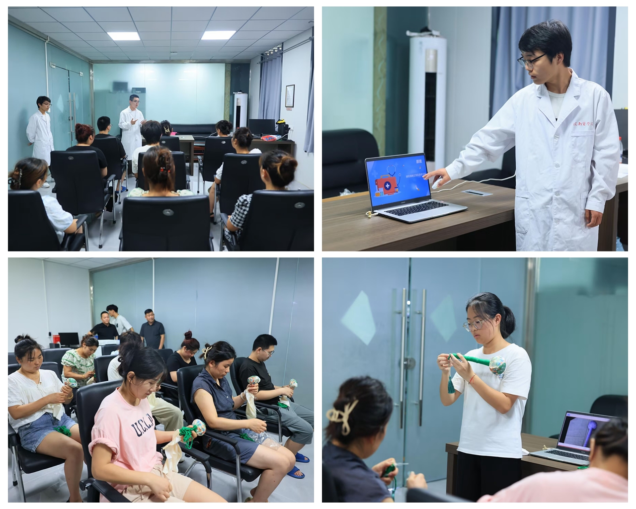 在阜南王家坝红亮产业投资公司,“仁心医者”志愿服务队与“行走的课程思政”公益团队联合开展“健康科普+非遗手作”特色活动。志愿者们以专业严谨的态度,详细讲解并示范了心肺复苏、海姆立克急救法等急救技能,指导公司员工认识AED设备和使用步骤,将守护生命的“黄金法则”烙印到每位参与者的脑海中。同时带领公司员工制作艾草养生锤,将传统艾草文化与现代养生理念相结合,缕缕清香中传递着对劳动者健康的关怀。公司员工们感慨:“既学了手艺,又懂了健康,这样的活动实在!”