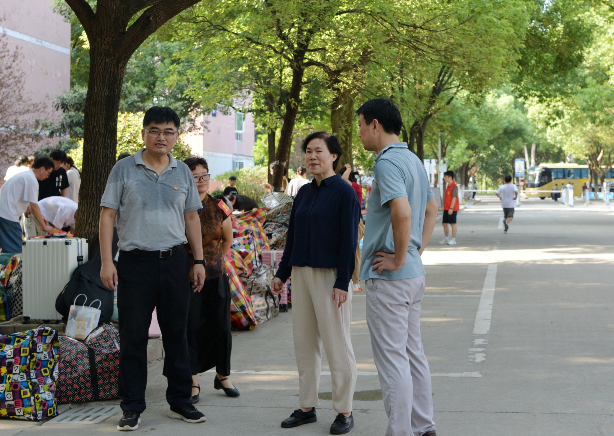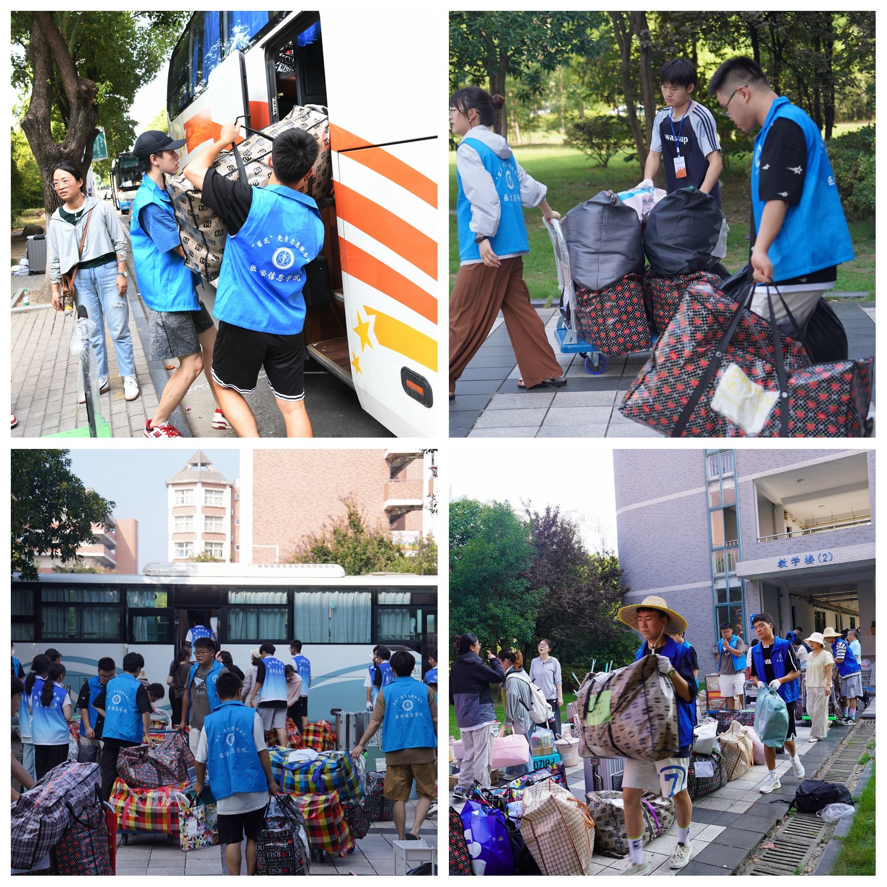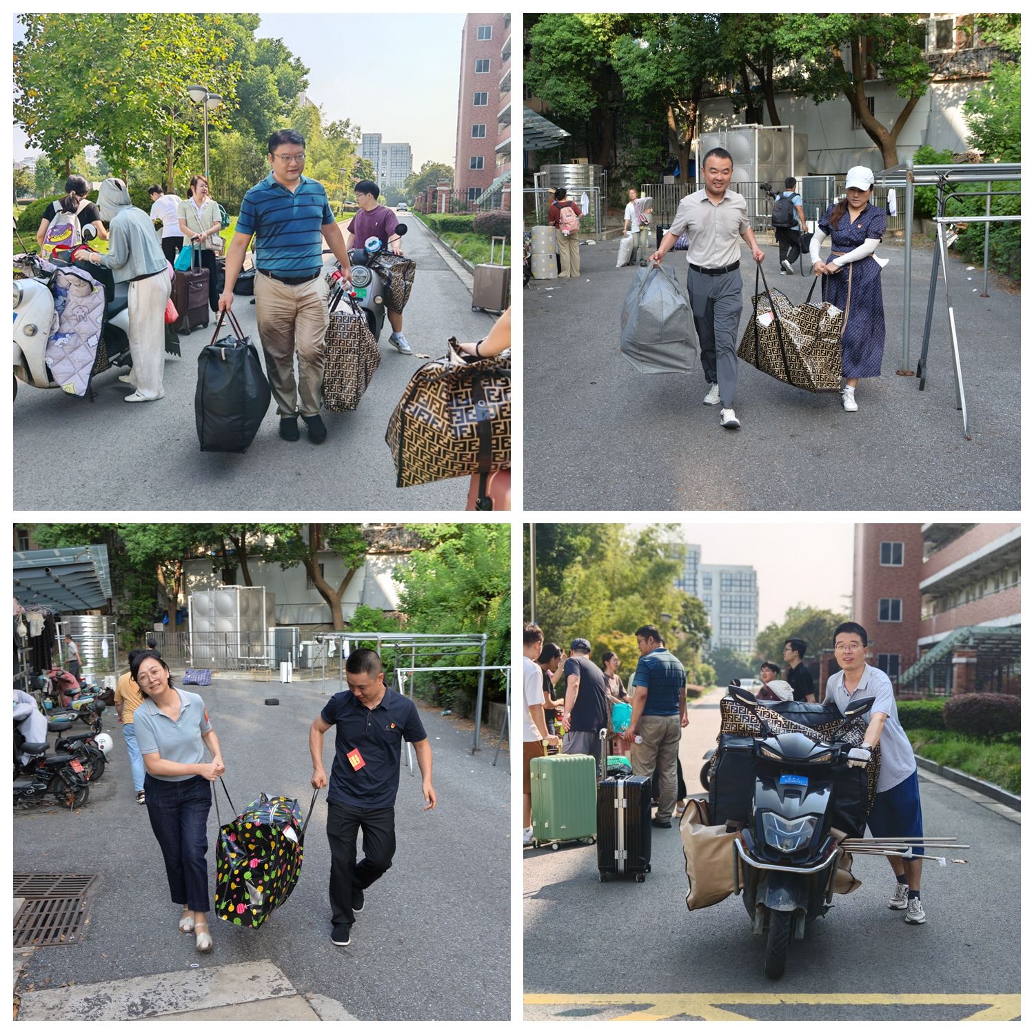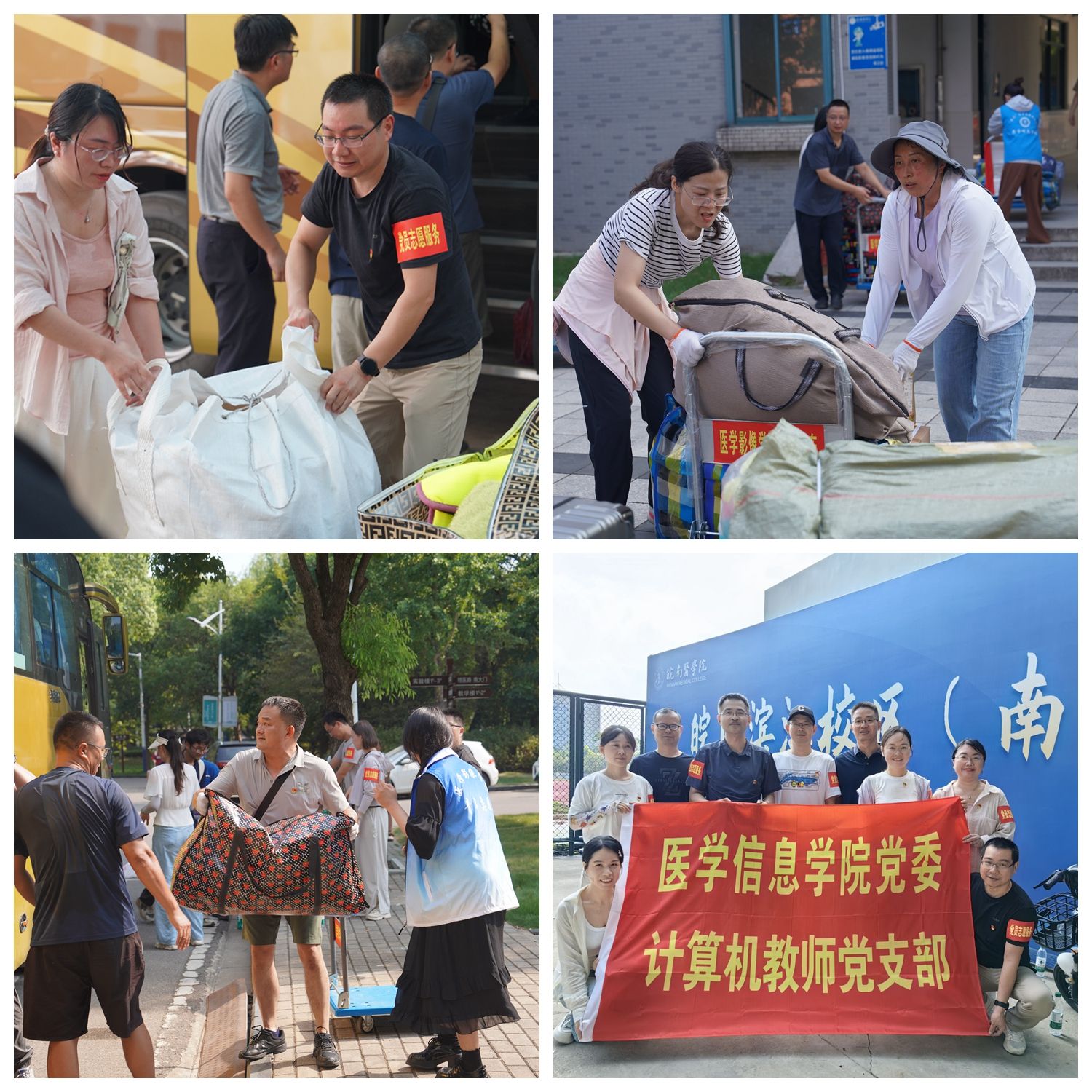 搬迁期间,学校组建了多支志愿服务队伍,包括由145名教工党员组成的党员志愿服务队、师生志愿服务队、后勤服务人员服务队等,与搬迁同学共同投入到校区搬迁工作中。虽烈日炎炎,但抵挡不住志愿者炽热的心,现场到处是志愿者忙碌的身影。大家分工明确、挺膺担当,手提肩扛、齐心协力,一次又一次穿梭于行李与车辆之间,一次又一次往返奔波于各楼层,即使汗水浸湿了衣衫却丝毫没有怨言。师生党员统一佩戴党员徽章,亮出党员身份,以身作则投入到搬迁工作中,让党旗在搬迁一线高高飘扬,让党徽在搬迁一线闪闪发光……从晨曦到日暮,在室外近40度的高温酷暑下,无论是搬运行李、疏散道路,还是解答疑问、提供指引,志愿者们都以饱满的热情和周到的服务做好各项工作,他们用劳累指数换来搬迁同学的笑脸指数、幸福指数,他们的身影成为了搬迁现场一道亮丽的风景线。