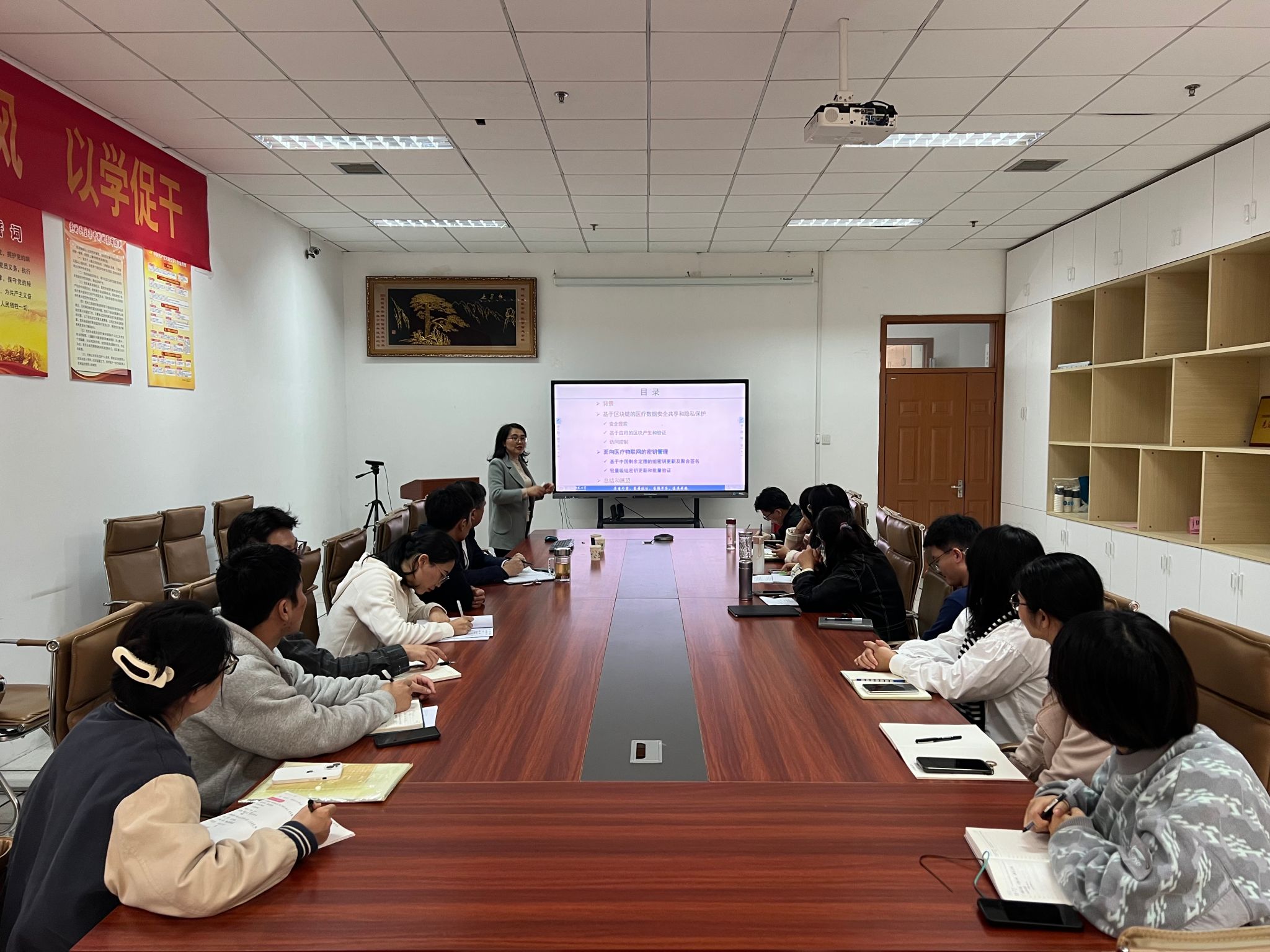 张爱清教授作题为“医疗区块链及医疗物联网数据安全共享和隐私保护”的学术报告。报告中,她详细介绍医疗区块链和物联网数据共享的前沿技术,重点介绍基于区块链的医疗数据安全共享、隐私保护和访问控制方法,以及在医疗物联网环境中实现数据共享与安全的关键技术。她还结合实际应用案例,展示其研究团队在基于应用的区块产生和验证,以及面向医疗物联网的密钥更新领域取得的突破性成果,并为当前医疗数据隐私保护所面临的挑战提供解决思路。在交流互动环节,张教授与师生们围绕医疗数据隐私和共享的技术难题进行深入探讨。