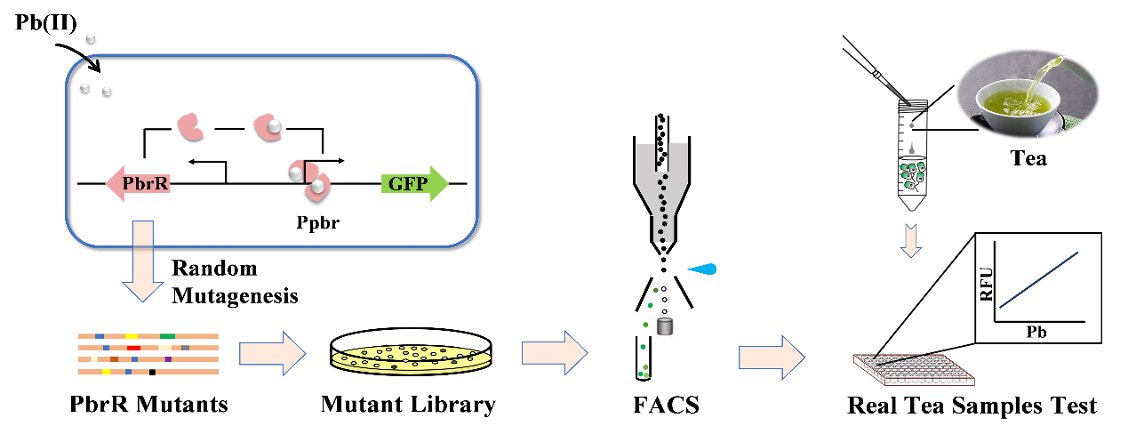 环境中的铅可通过食物摄入进入人体,监测食品中生物可利用的铅含量对确保食品安全和公众健康至关重要。传统的铅污染检测方法依赖于大型分析仪器,成本高、费时费力,且需要在专门的实验室由专业人员操作。铅细菌生物传感器操作简便,但灵敏度较低且特异性差。针对以上问题,团队运用定向进化技术,对铅诱导型生物传感器感知模块的核心元件-铅响应蛋白(PbrR)进行改造,通过高通量筛选,获得高性能的突变体。以此蛋白突变体构建的进化后生物传感器的荧光输出信号增强,灵敏度和相对特异性也显著提高,检测限提升至0.045 μg/L。加标水样的抗干扰实验结果验证了该生物传感器的良好稳定性。此外,在检测真实茶水中的铅离子时,进化后生物传感器的检测结果与石墨炉原子吸收光谱法测定的结果非常接近。这项研究为检测环境与食品中的可利用铅含量提供了一种简便高效的方法。(沈亮/文、图